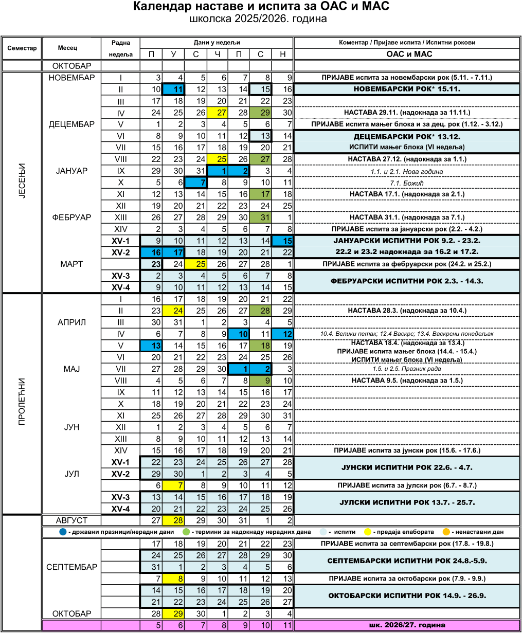 почетак » Студије на Машинском факултету » Календар наставе и испита школске 2025/2026. године
