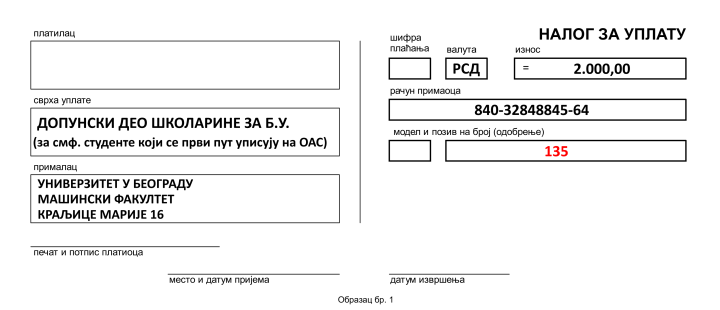 * НАПОМЕНА: За стране студенте који се сами финансирају допунски део школарине за У.Б. уместо 2.000,00 динара износи 2.500,00 динара.