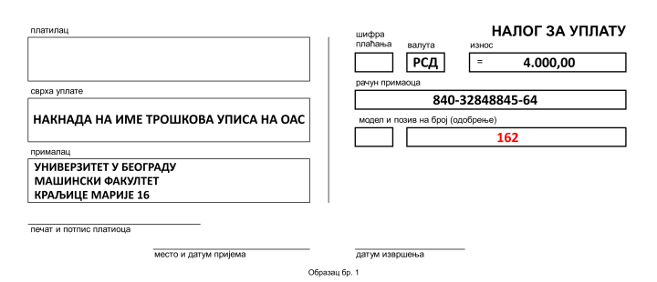 За полагање пријемног испита и друге трошкове које има Факултет у вези са пријавом и полагањем пријемног испита, кандидати уплаћују појединачно за студијски програм за који конкуришу накнаду од 4.000,00 динара на жиро-рачун Машинског факултета број: 840-32848845-64 са сврхом уплате накнада за пријемни испит за одговарајући студијски програм (навести који) и позивом на број 141.