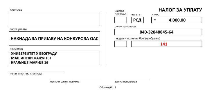 За полагање пријемног испита и друге трошкове које има Факултет у вези са пријавом и полагањем пријемног испита, кандидати уплаћују појединачно за студијски програм за који конкуришу накнаду од 4.000,00 динара на жиро-рачун Машинског факултета број: 840-32848845-64 са сврхом уплате накнада за пријемни испит за одговарајући студијски програм (навести који) и позивом на број 141.
