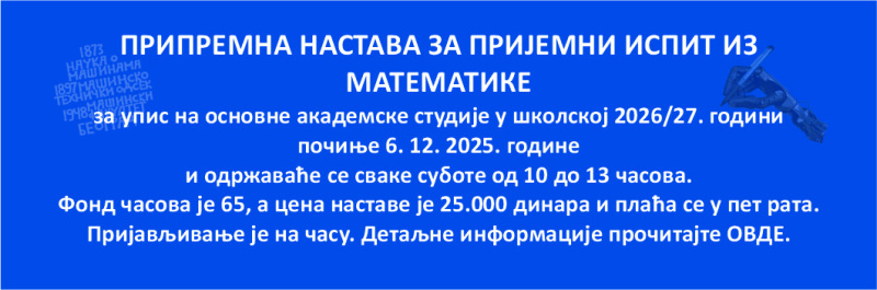 Припремна настава за полагање квалификационог испита из предмета МАТЕМАТИКА за упис на Основне академске студије школској 2026/2027. години почиње 6. децембра 2025. године и одржаваће се суботом од 10 до 13 часова. На улазу на Факултет биће истакнуто обавештење у којој сали се одржава настава.